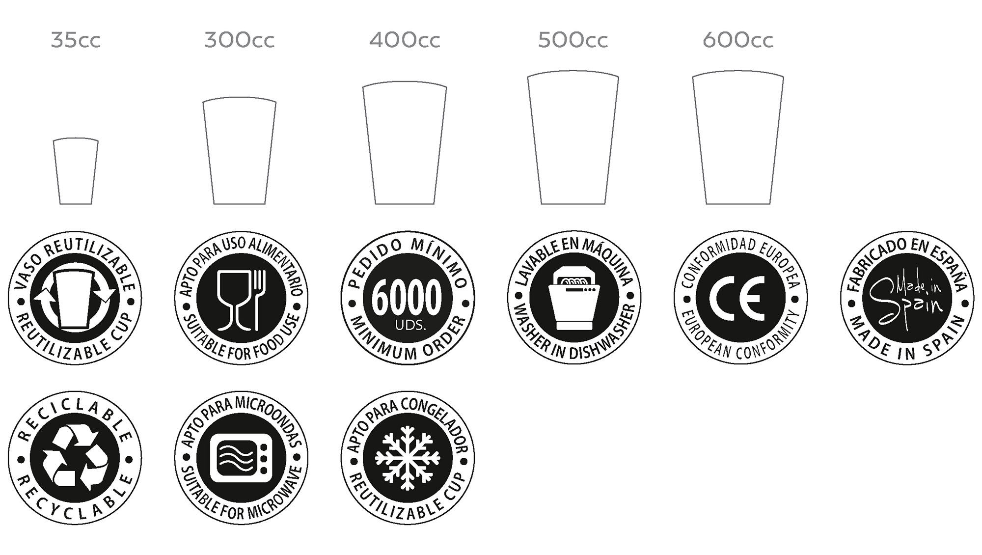 Différentes capacités, gobelet réutilisable et recyclable . Idéal pour les festivals, événements sportifs, foires, congrès, fêtes populaires, etc.